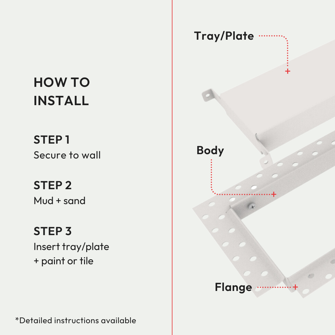 + Reversible center tray allows for flush installation in either substrate or drywall