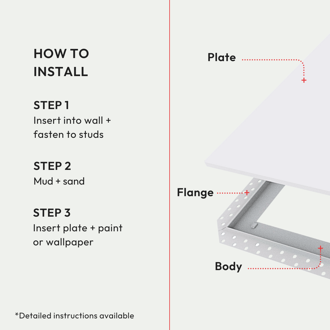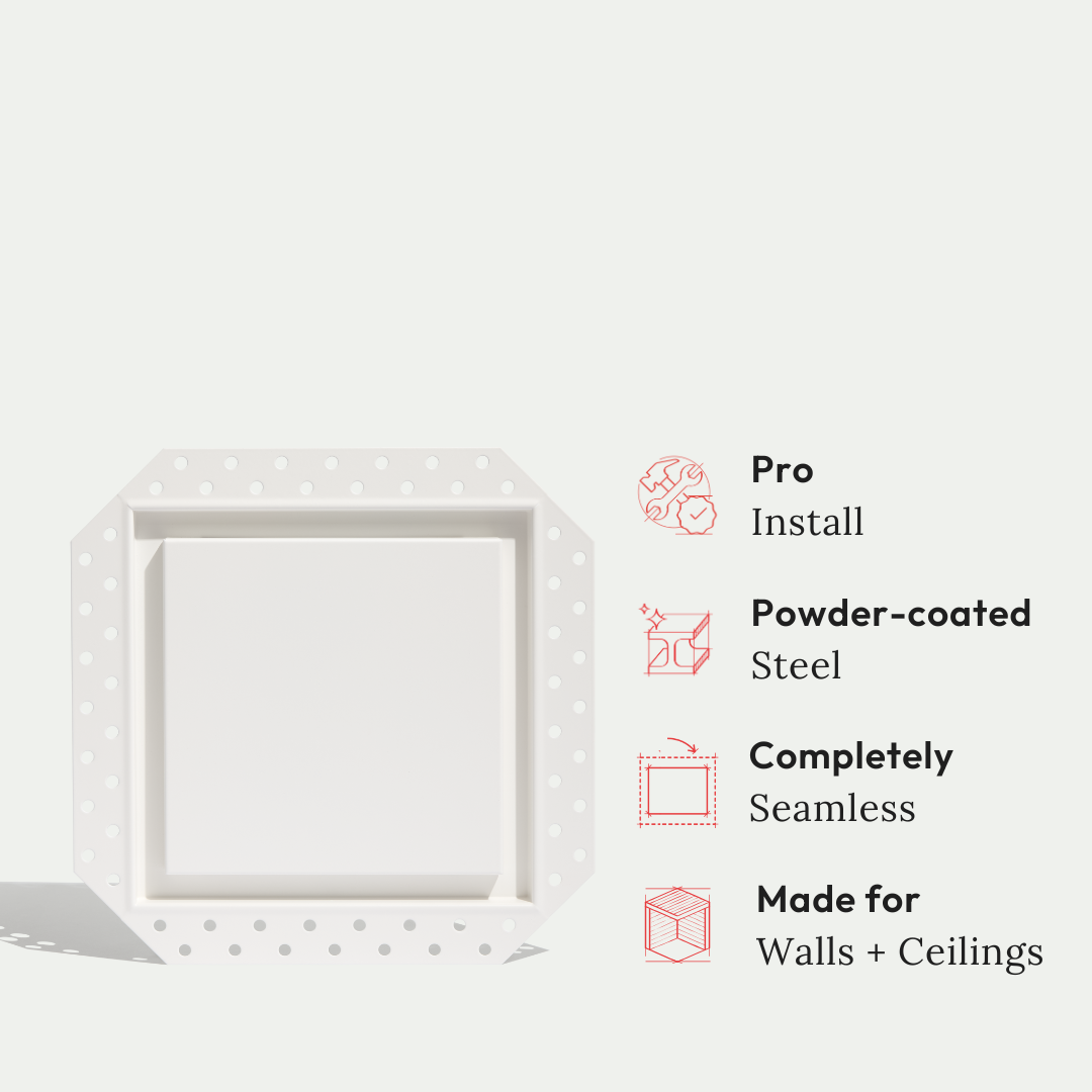 This is the Flush model. It requires mudding and sanding to achieve a flush finish, so it’s best tackled by someone experienced with drywall. If that’s not you, we recommend calling a pro! Alternatively, use the Framed Access Panel [Luxe] — installation is simple and requires minimal tools. Just cut a hole in the drywall and fasten the panel with the provided screws. Check our handy install guide for step-by-step instructions for both models.