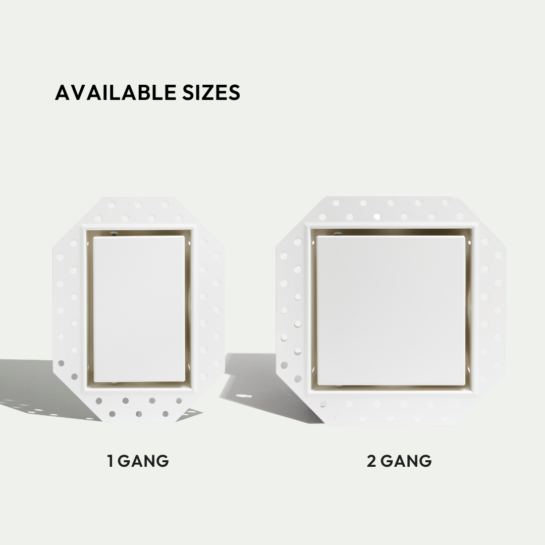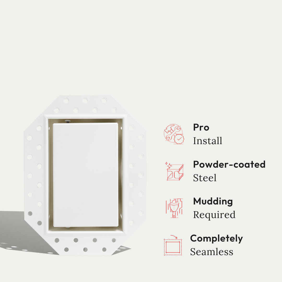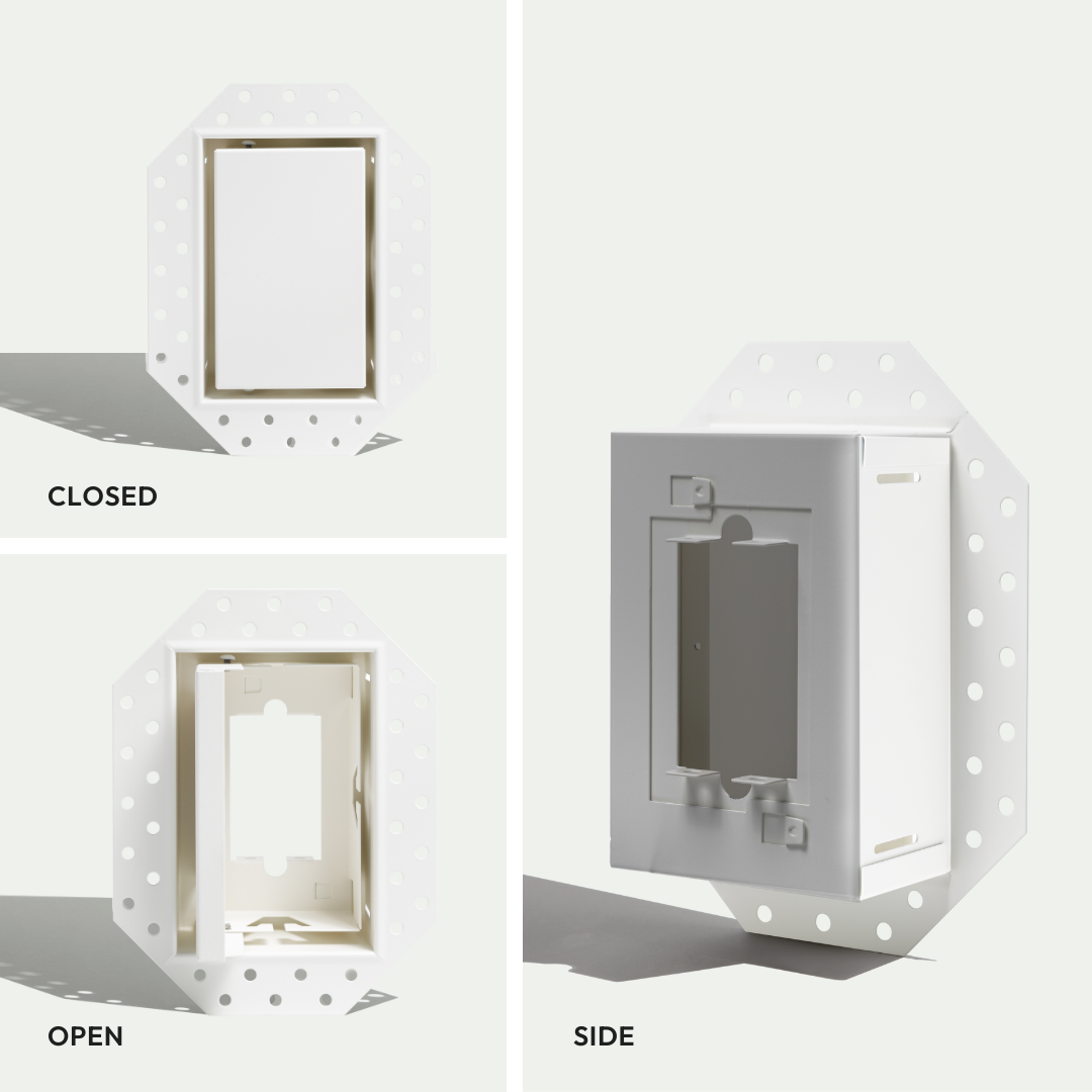 Ultra-minimalist receptacle mount for light switches, outlets, Ethernet and phone receptacles, and more. Customizable hinged door with a flush finish for a seamless design that blends right into the wall — once closed, only a rectangular groove is visible. Pro install in 30 minutes. Requires drywall mudding.