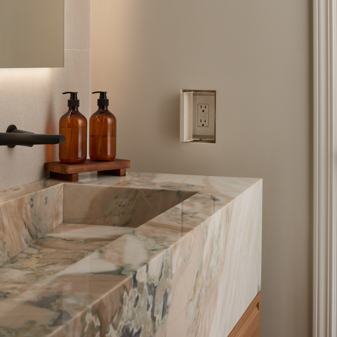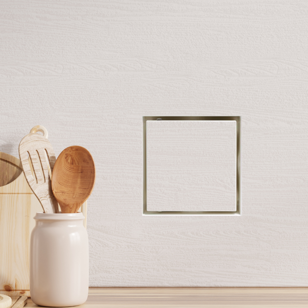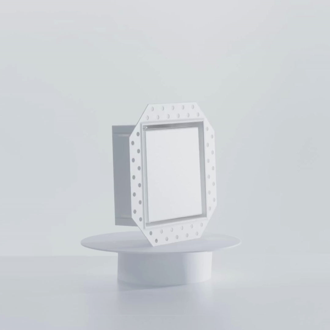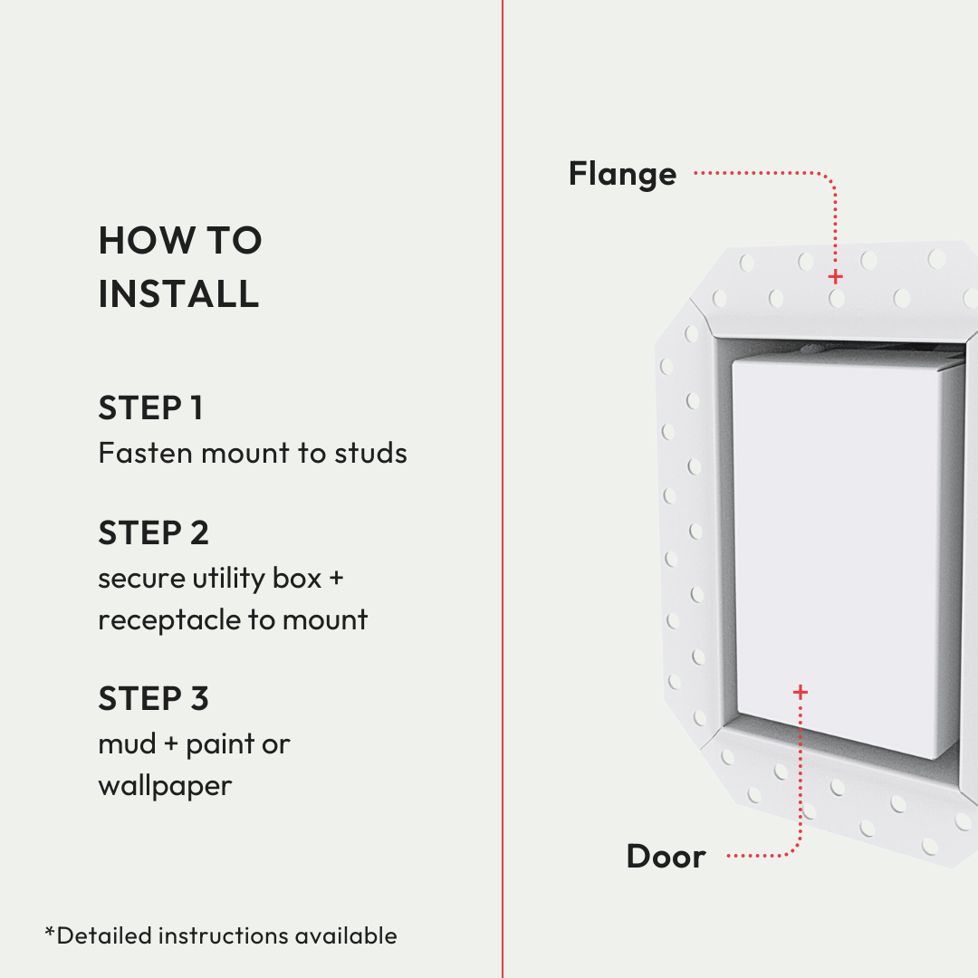 Ultra-minimalist receptacle mount for light switches, outlets, Ethernet and phone receptacles, and more. Customizable hinged door with a flush finish for a seamless design that blends right into the wall — once closed, only a rectangular groove is visible. Pro install in 30 minutes. Requires drywall mudding.