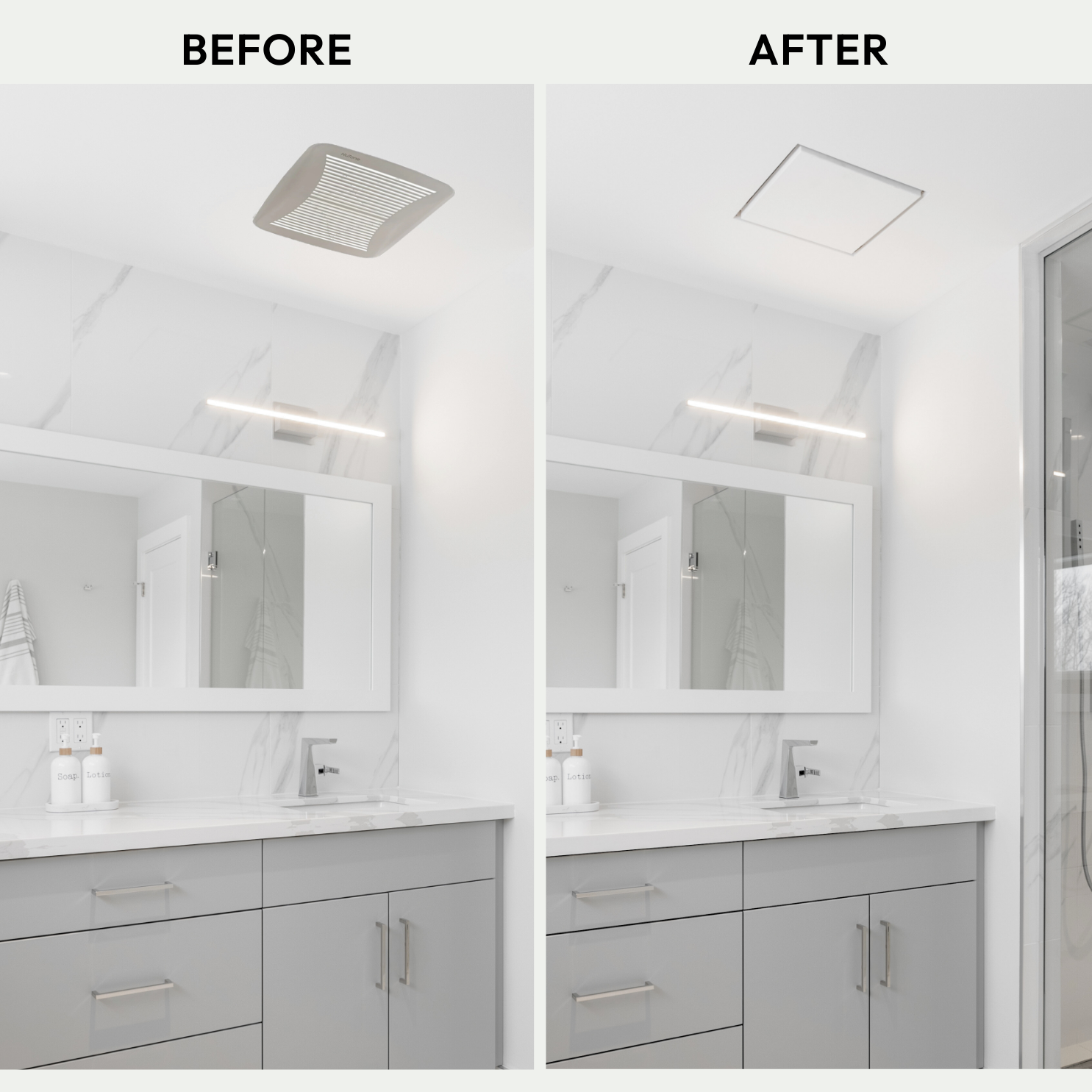 We’ve reimagined old-fashioned grille exhaust mounts. An innovative, ultra-minimalist design seamlessly blends right into the wall or ceiling. Customizable powder-coated steel center tray hides the mount in plain sight — once installed, only a rectangular air channel is visible. Pro install in 30 minutes. Requires drywall mudding.