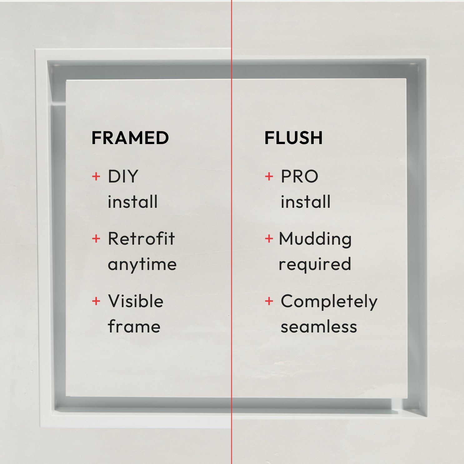 This is the Flush model, which sits level with the wall surface. It requires drywall mudding and sanding to create a seamless, contoured look that blends into the wall, so it’s best installed by a professional. In comparison, the Framed model has a rim that sits on top of the wall surface, creating a visible border and allowing for an easy, DIY-friendly drop-in installation.