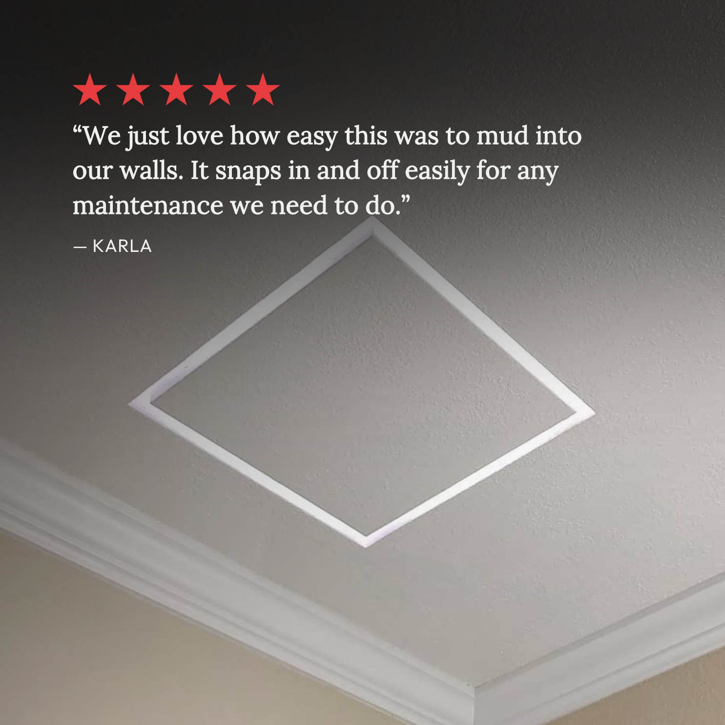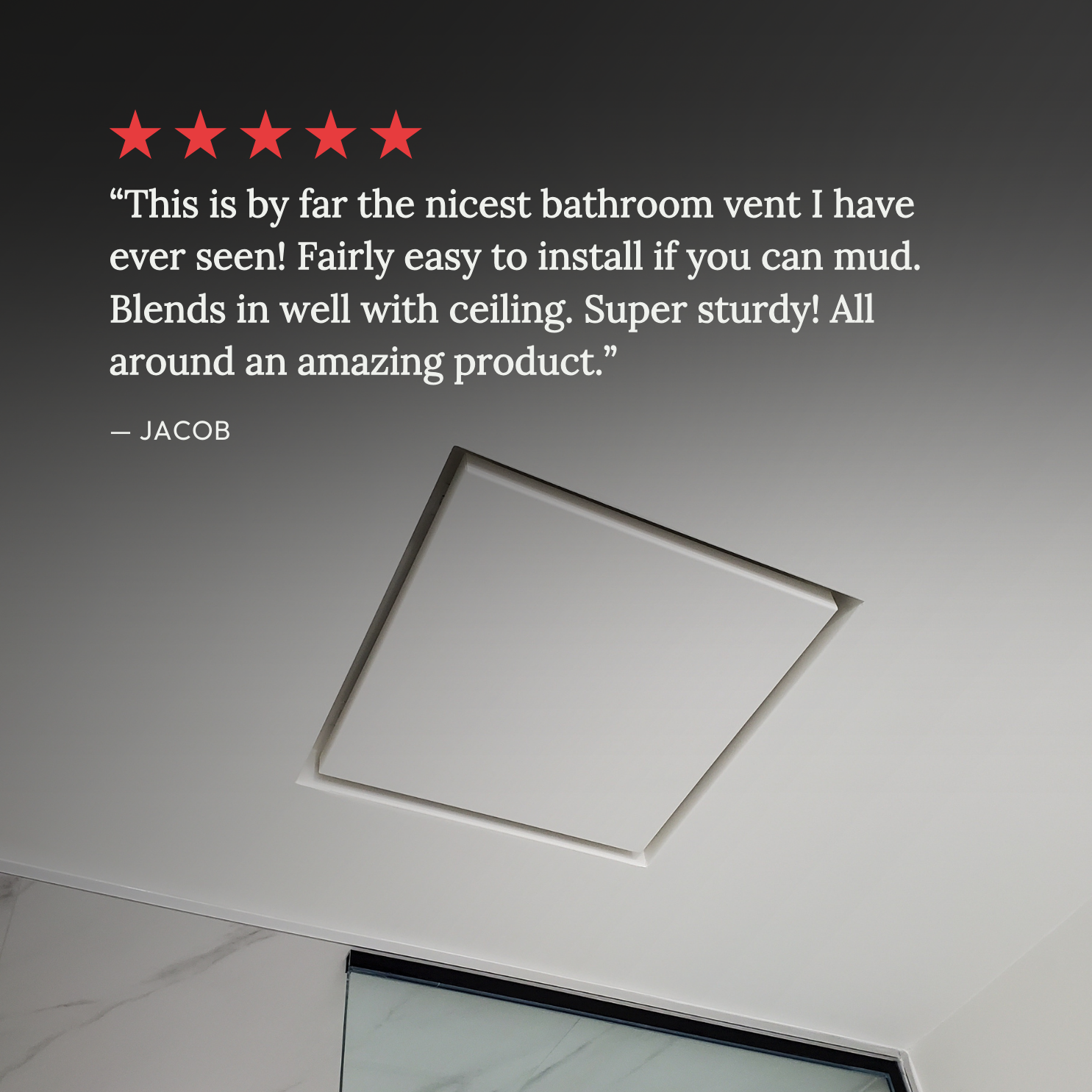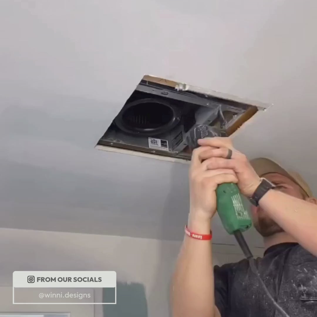This is the Flush model. It requires mudding and sanding to achieve a flush finish, so it’s best tackled by someone experienced with drywall. If that’s not you, we recommend calling a pro! Alternatively, use the Framed Exhaust Mount [Luxe] — installation is simple and requires minimal tools. Just cut a hole in the drywall (if needed) and fasten with the provided screws. Check our handy install guide for step-by-step instructions for both models.