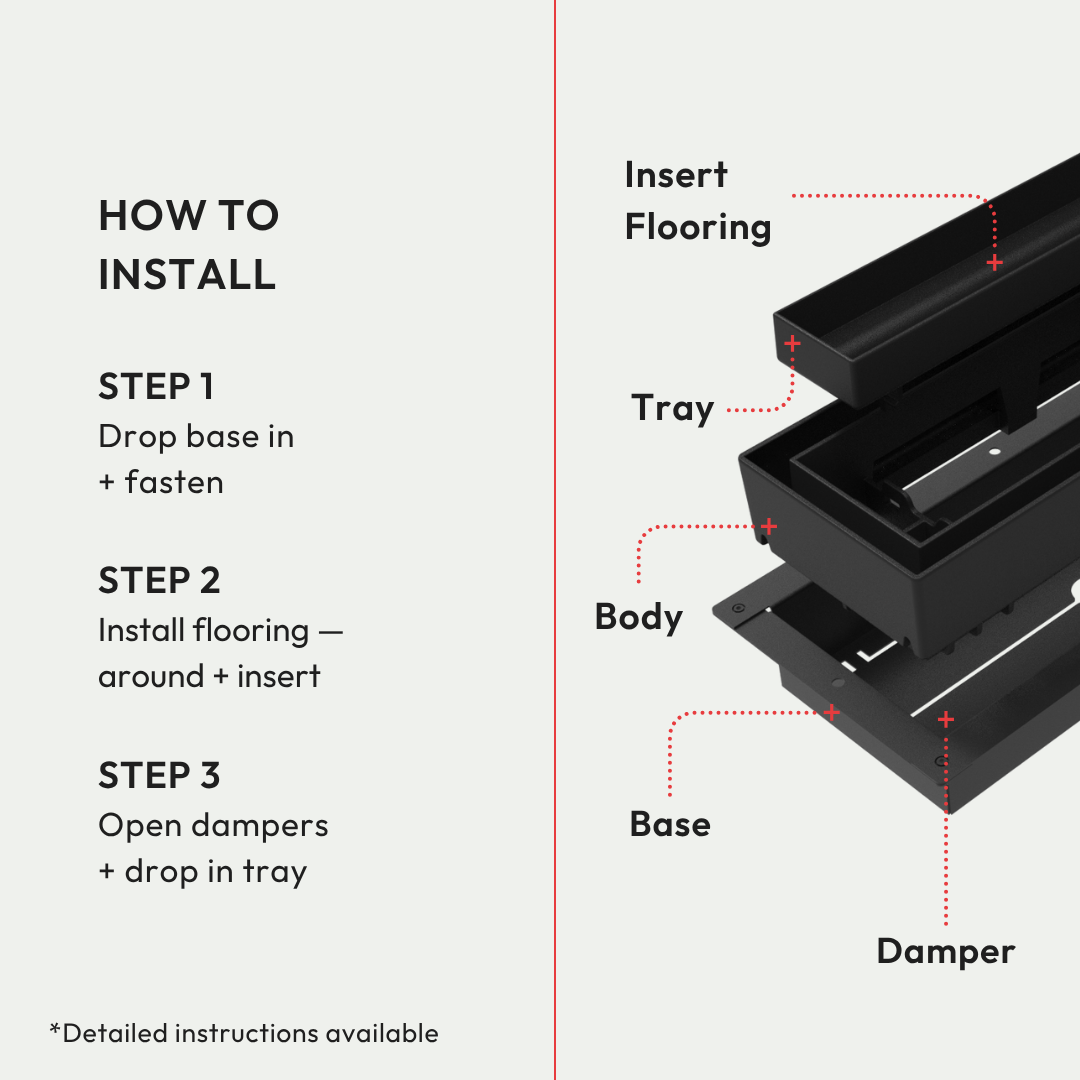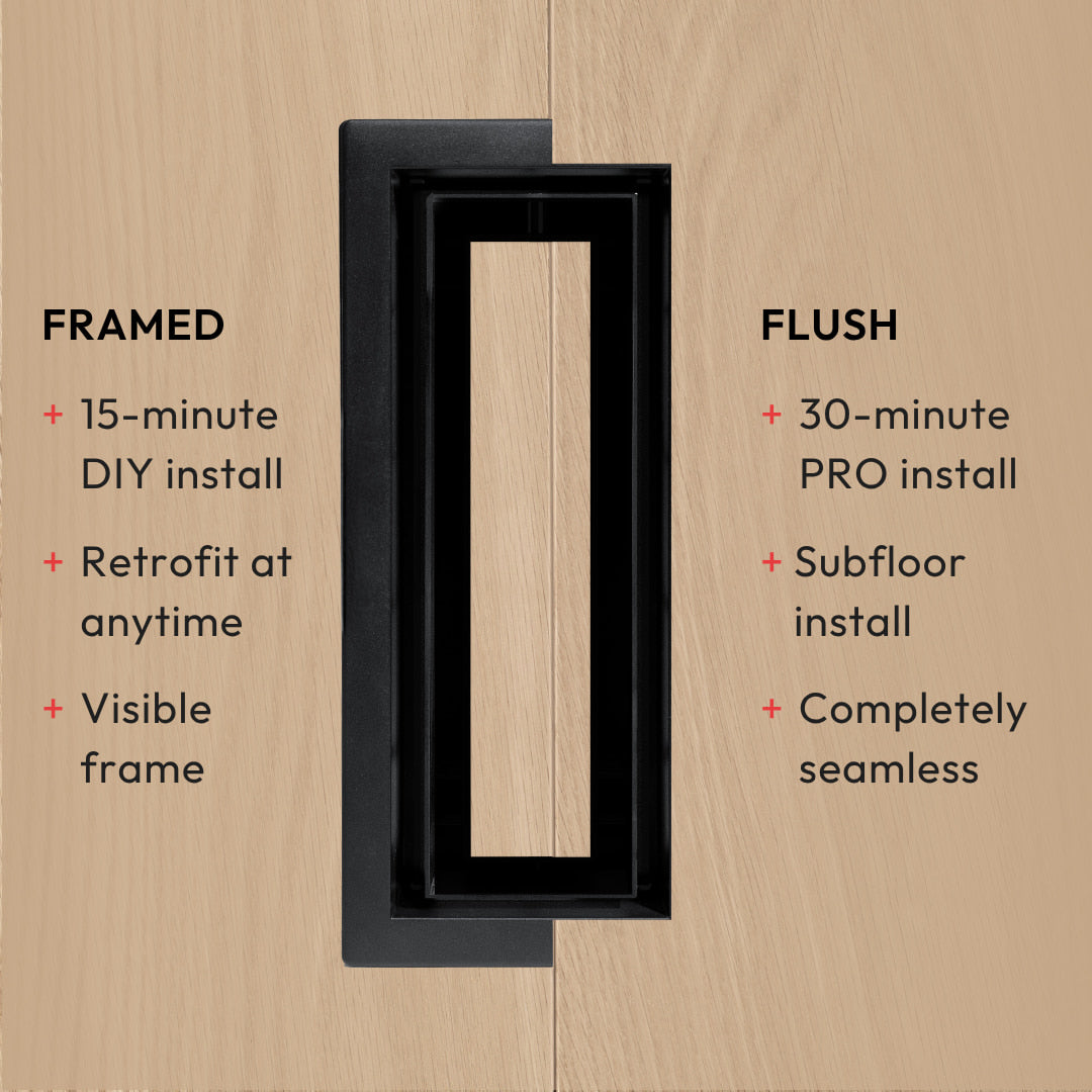 The customizable center tray hides the vent in plain sight—once installed, all you see is a clean, rectangular air channel. The Flush model is a sleek, low-profile upgrade compatible with any flooring material. Integrated dampers. Pro install in 30 minutes. Must be mounted before flooring. HVAC-compatible.