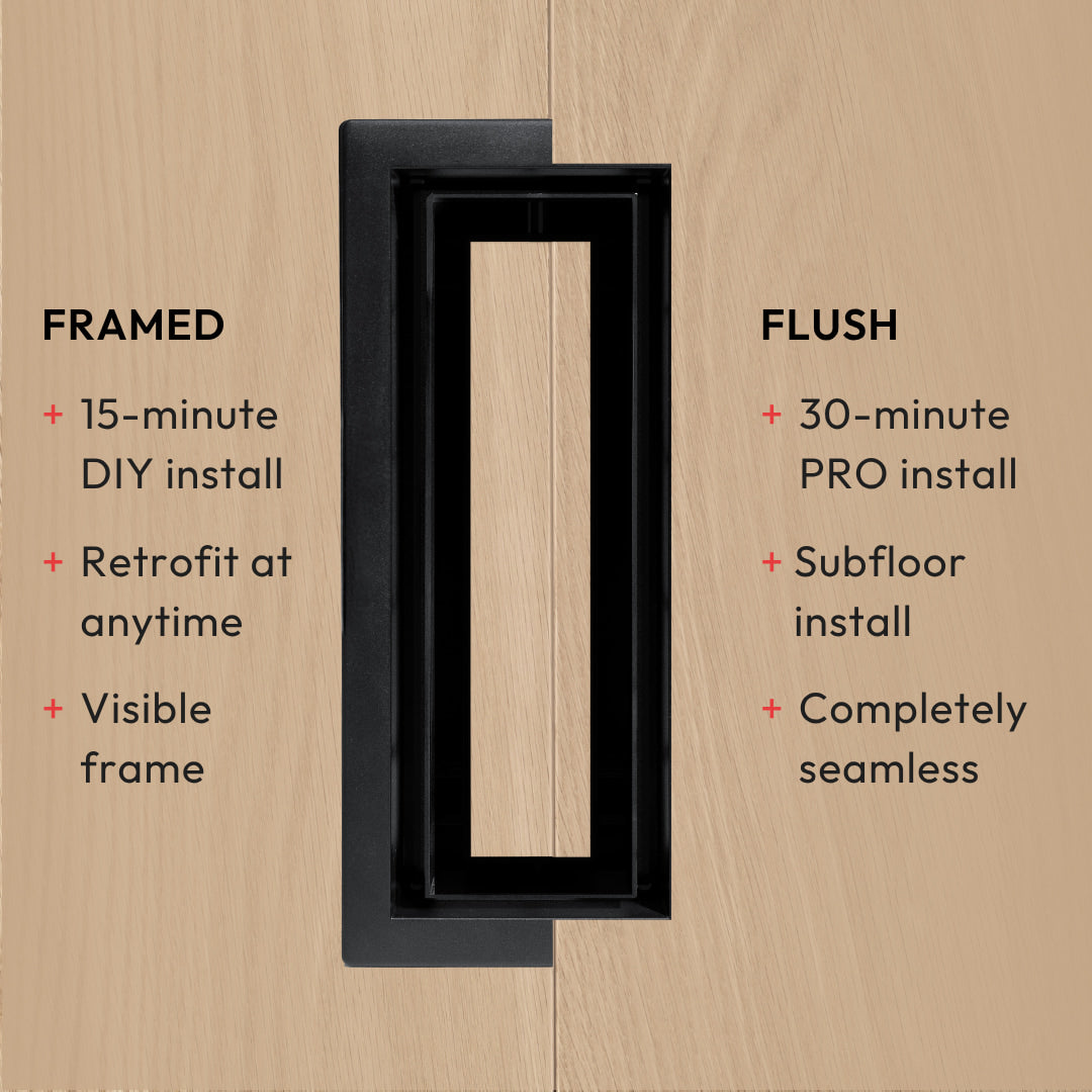 This is the Framed model — installation is simple and requires minimal tools. Just cut a piece of your flooring material, glue it onto the vent’s inner tray, and screw it in for super-easy, DIY framed floor vent installation. In comparison, the Flush model needs to be professionally mounted at the subfloor level, before installing the surface material. Check our handy install guide for step-by-step instructions for both models.