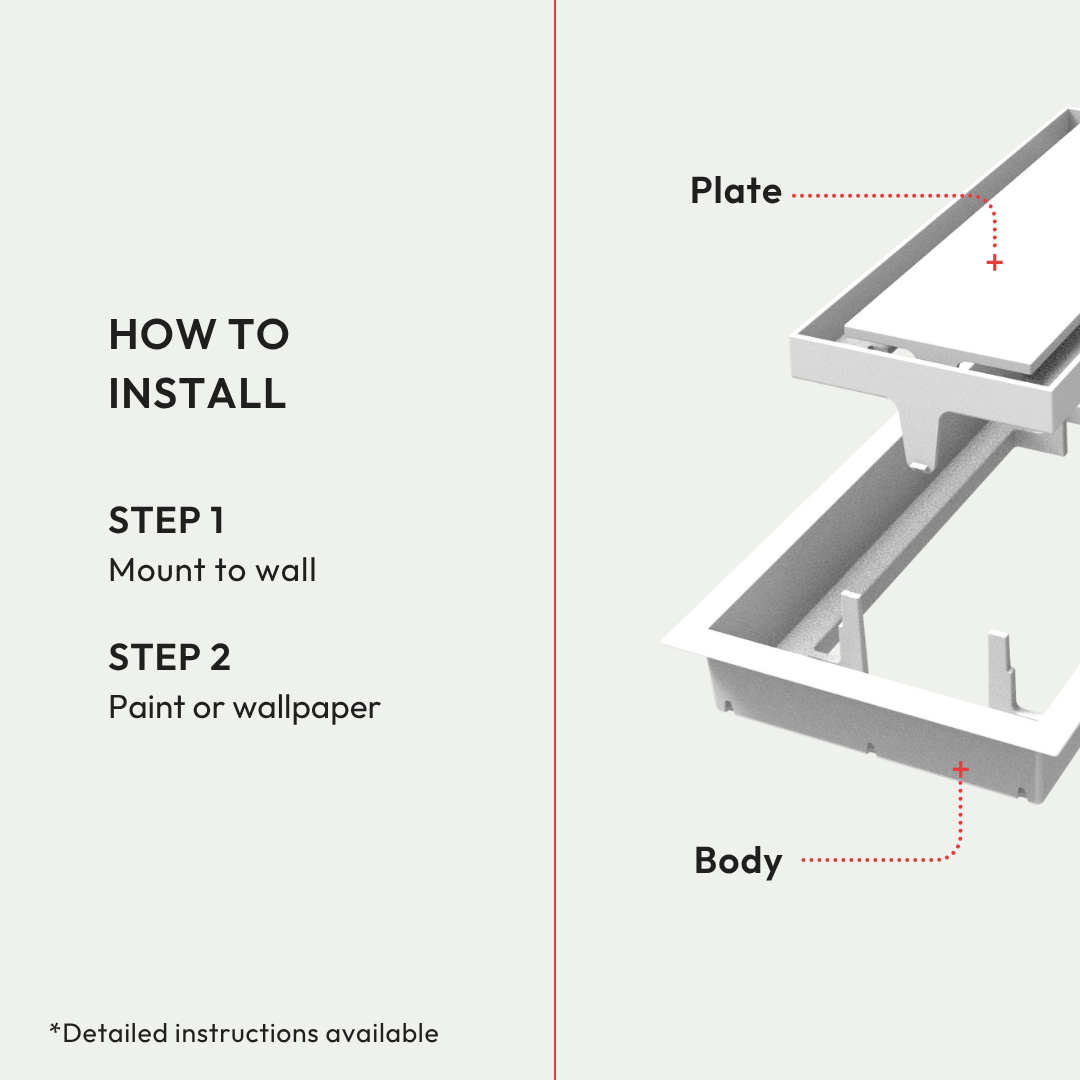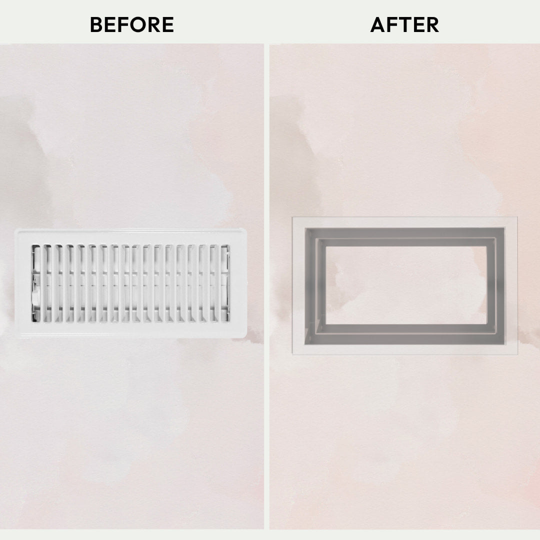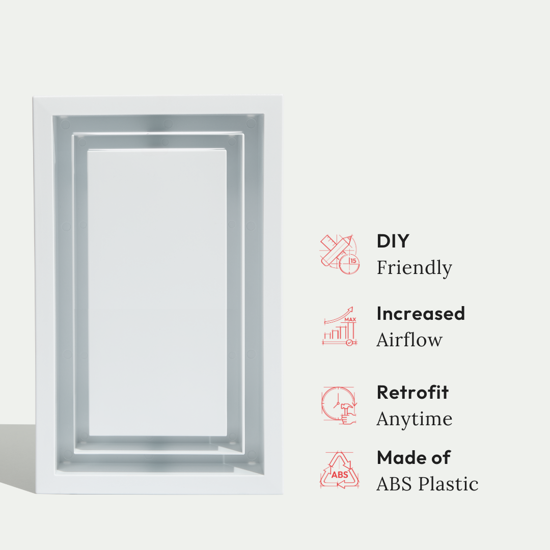 A paintable center plate hides the vent in plain sight. Better looking than a traditional grille, it’s an easy, affordable, brag-worthy upgrade to any space. Super-easy, 15-minute DIY install. Retrofit anytime. Drywall and HVAC-compatible.