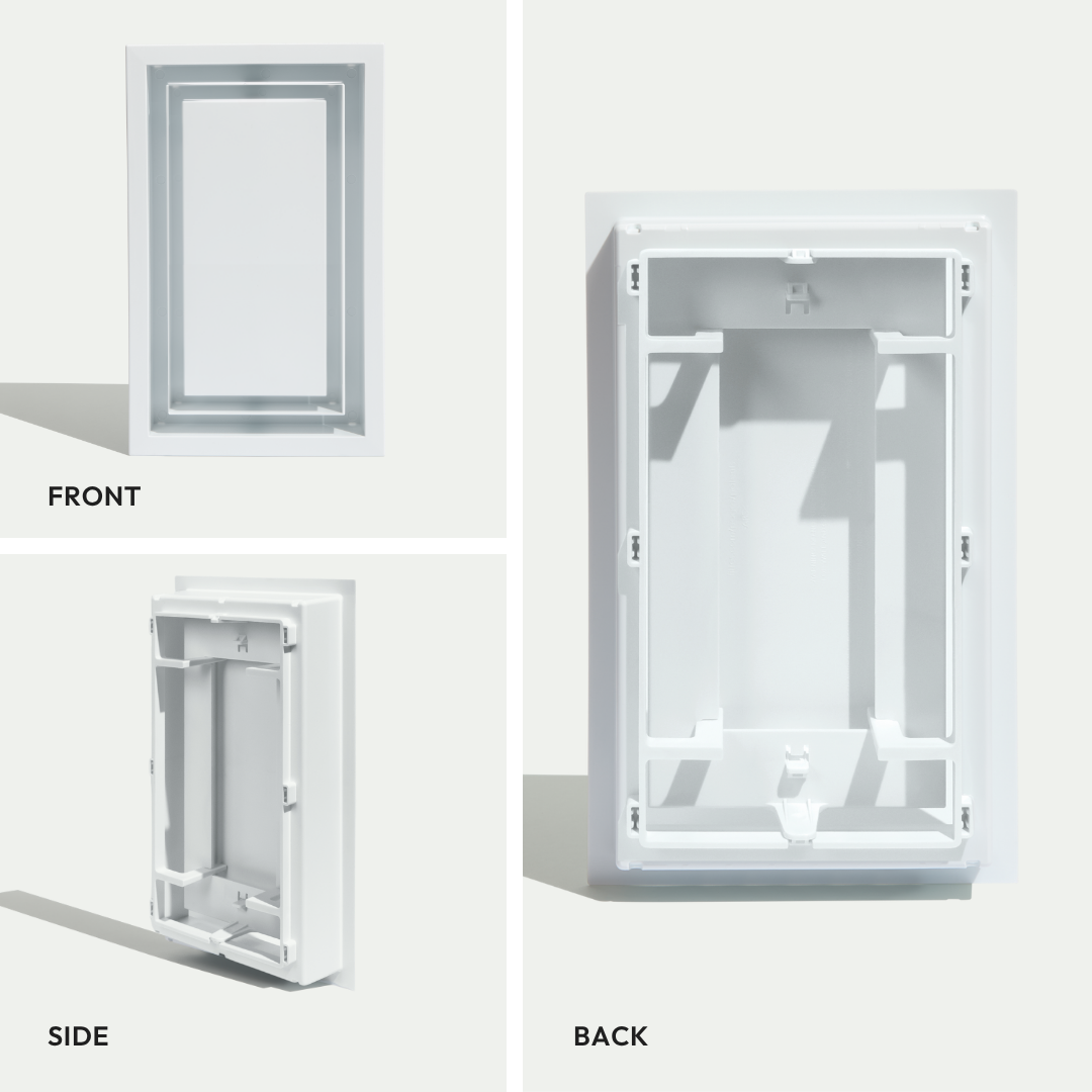 This is the Framed model, which has a visible rim that sits on top of the wall surface—making it ideal for quick, easy, DIY installation. In contrast, the Flush model sits level with the wall for a seamless look, but requires mudding and sanding during installation.