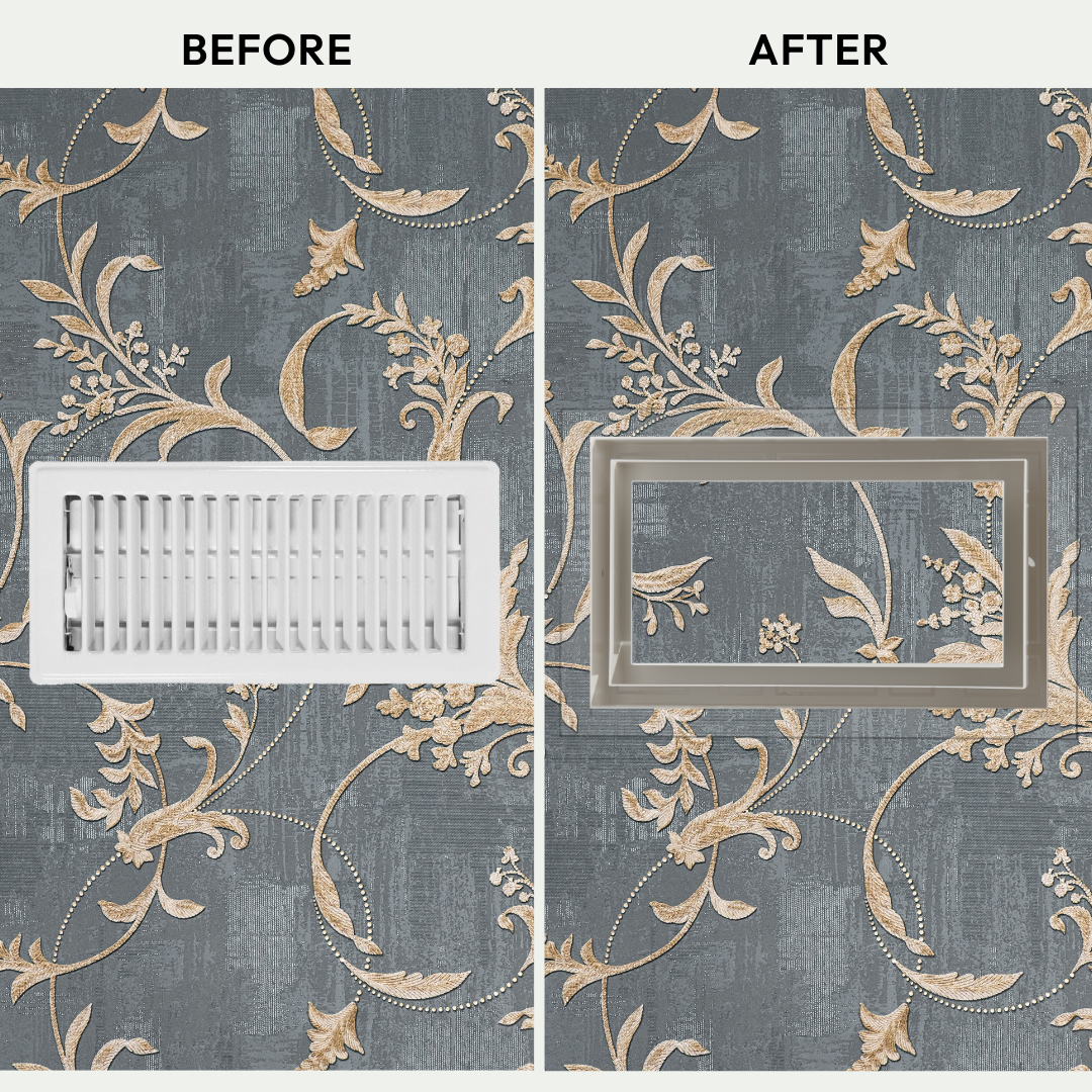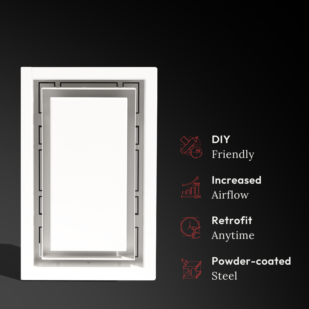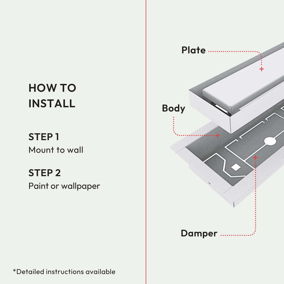A paintable center plate hides the vent in plain sight. Includes integrated dampers. Super-easy, DIY-install in 15 minutes. Retrofit anytime. Drywall and HVAC-compatible.