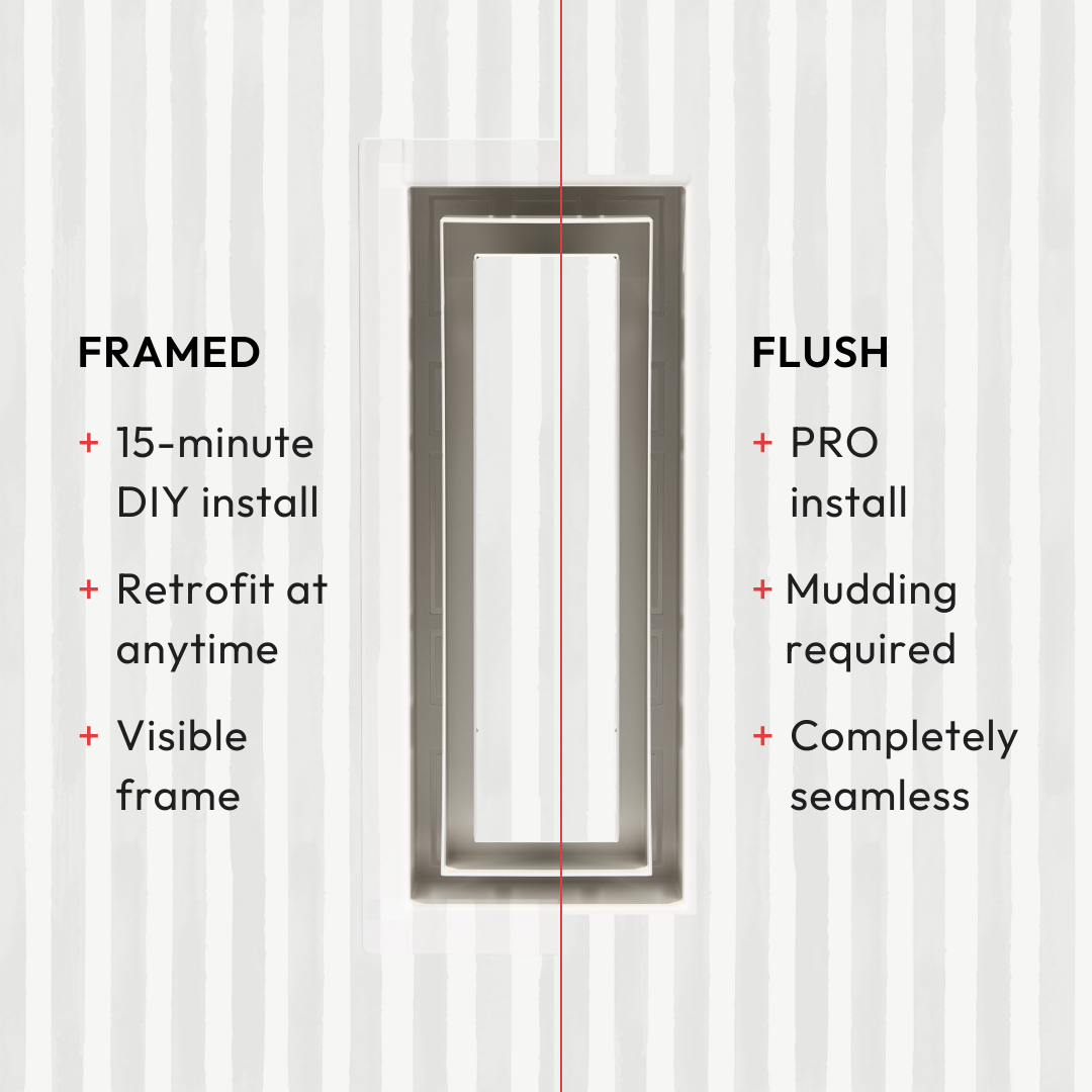 This is the Framed model, which has a visible rim that sits on top of the wall surface—making it ideal for quick, easy, DIY installation. In contrast, the Flush model sits level with the wall for a seamless look, but requires mudding and sanding during installation