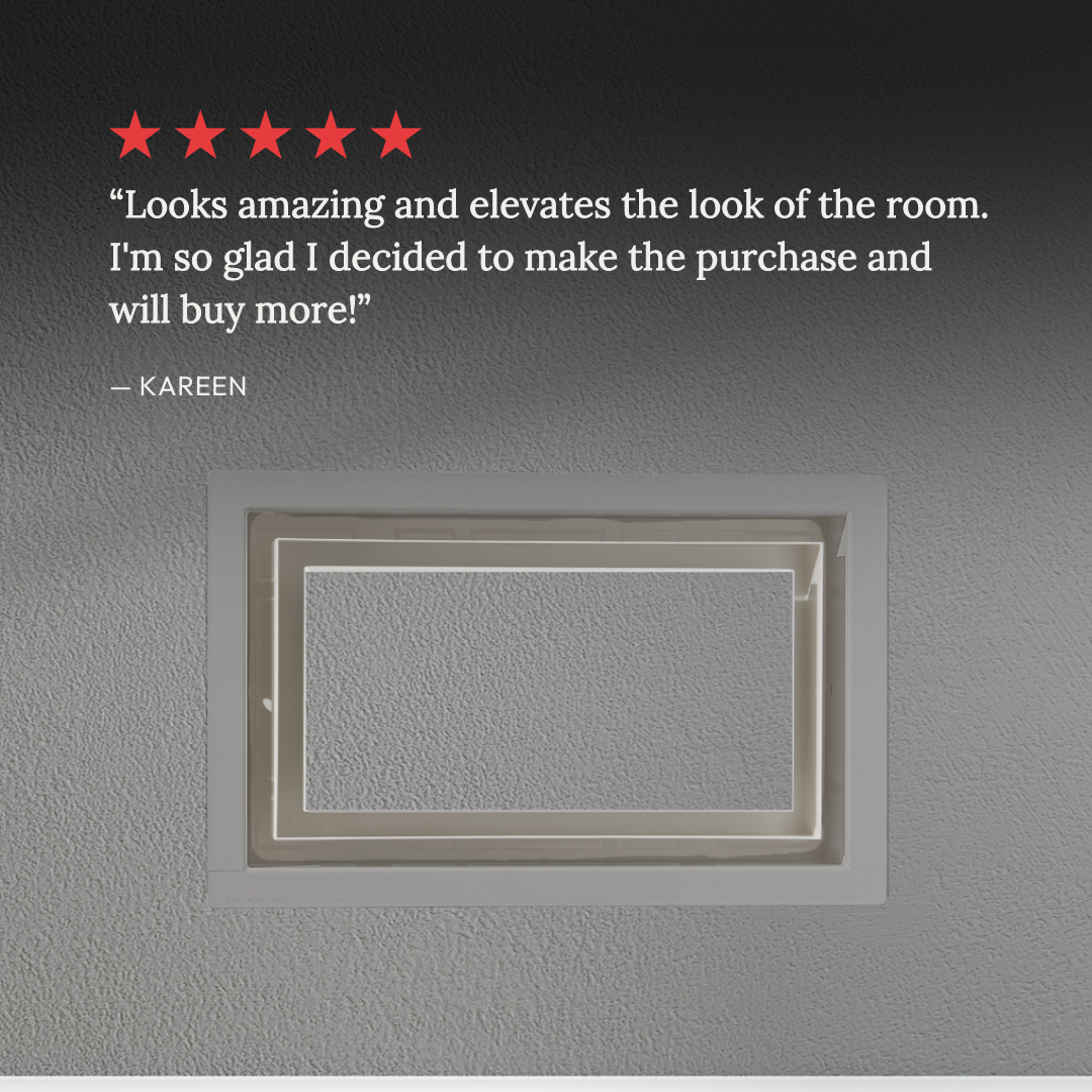 This is the Framed model—easy to install with just a few basic tools. Simply drop it into the duct and secure it with the included screws. The Flush model, on the other hand, involves mudding and sanding, so it’s better suited for someone with drywall experience. (If that’s not you, we suggest bringing in a pro!) For full step-by-step instructions, check out our install guide for both models.