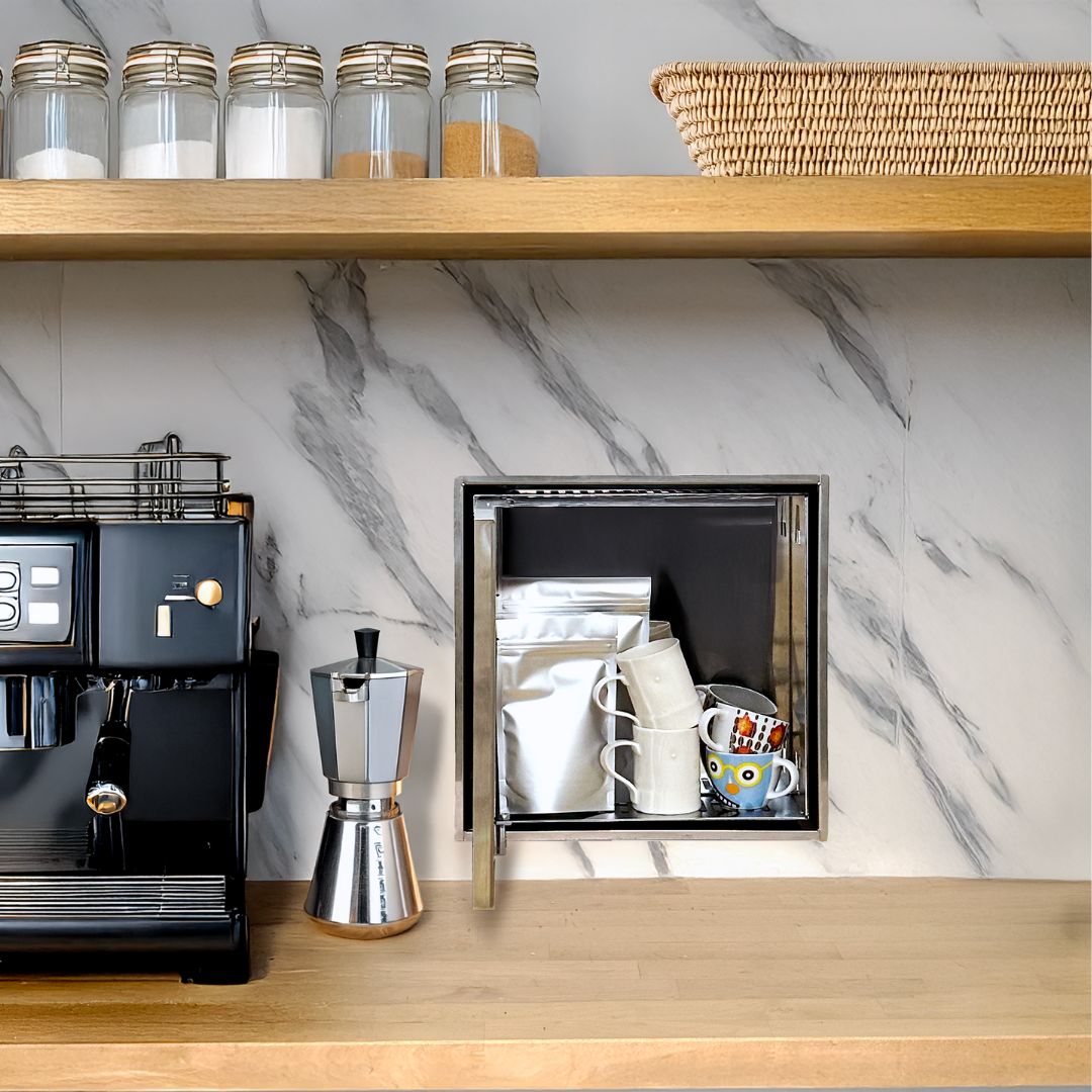 Ultra-minimalist, recessed niche for optimizing counter space. Keeps kitchen essentials like coffee supplies, spices, or sink-side cleaning products hidden, yet handy. A recessed cubby with a hinged door blends right into the wall — once closed, only a square groove is visible. Customizable with any tile up to ½" thick. Pro install in 30 minutes. Requires tiling and waterproofing, depending on application.